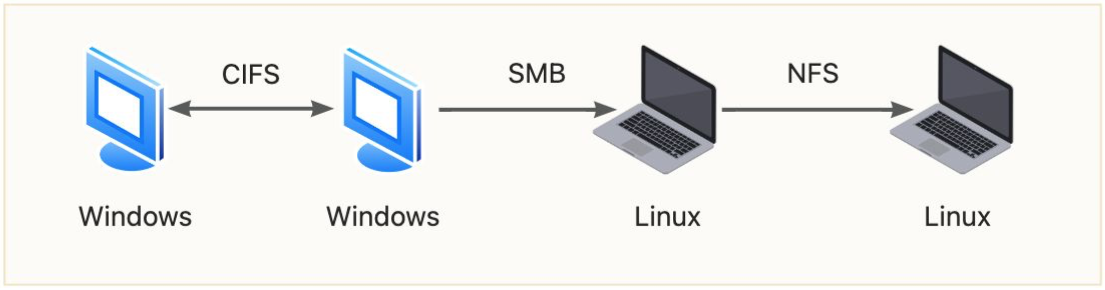 CIFS:Common Internet File System 。是微软主导开发的一种网络文件共享协议。它基于 SMB(Server Message Block)协议,广泛应用于 Windows 网络环境中。基于 TCP。