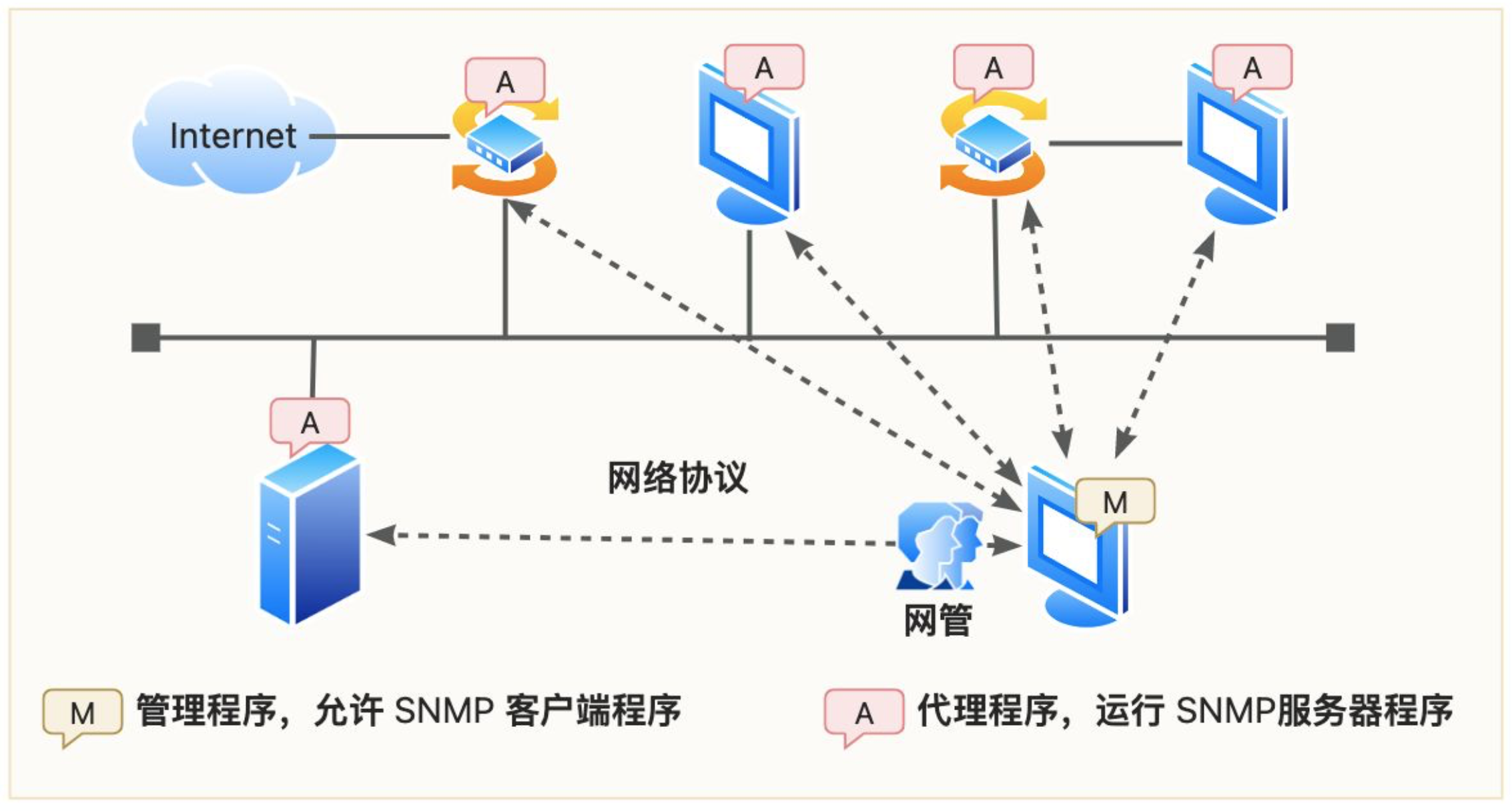 SNMP:Simple Network Management Protocol,简单网络管理协议。网络监控、故障管理、配置管理、性能管理。大家熟悉的网吧的网管,就是操作 SNMP 服务器程序来管理网吧网络的。