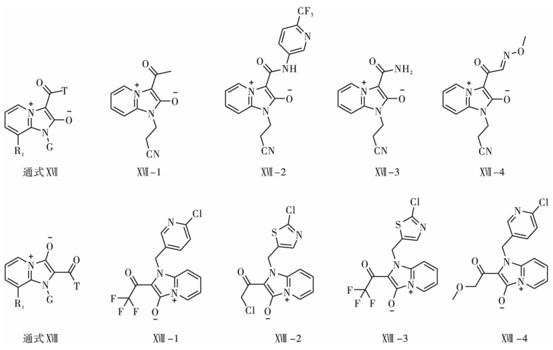 2018年拜耳公司报道了吡啶并咪唑类介离子化合物ⅩⅦ(见图17),它的3-位引入了羰基结构,化合物ⅩⅦ-1~ⅩⅦ-4在4 mg/L的质量浓度下对桃蚜的致死率可达到100%;其中化合物ⅩⅦ-3在100 mg/L的质量浓度下,对猫栉头蚤(Ctenocephalides felis)和家蝇对致死率均能达到100%。除此之外,拜耳公司还报道了类似的一类化合物ⅩⅧ(见图17),这类化合物对桃蚜也具有不错的杀虫活性。生测数据显示,该类化合物在20 mg/L的质量浓度下对桃蚜具有很好的防效,其中ⅩⅧ-1~ⅩⅧ-4在4 mg/L的质量浓度下对桃蚜的致死率仍为100%。此外这类化合物对褐飞虱、稻绿蝽、草地贪夜蛾等也有一定的活性。