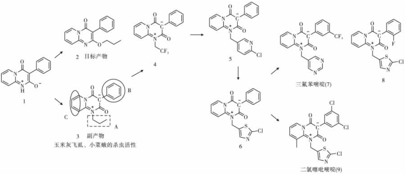 该杀虫剂的发现起源于杀菌化合物合成过程中的一个副产,20世纪90年代,杜邦公司在研发防治白粉病杀菌剂时,使用原料1合成了其较为感兴趣的化合物2,并分离出了N-烷基化副产物3。在随后的温室生物活性测试过程中发现,1和2均未表现出预期的杀菌杀虫活性。然而,2005年,杜邦公司在增加了新的杀虫靶标后,对其原有化合物进行新一轮的筛选中发现,化合物3对玉米花翅飞虱(Peregrinus maidis)和小菜蛾(Pluella xylostella)表现出一定的杀虫活性。这引起了杜邦对这类结构新颖的化合物的关注,接下来的几年对3的A、B、C三部分展开优化,首先替换A部分的不同烷基取代,发现正丙基取代具有最优的活性,大于(如正丁基)或小于(如甲基)正丙基的烷基链都会导致活性下降。除此之外,当A部分为正丙基时,介离子稠环的C部分进行优化时未表现出更好的杀虫活性。在此基础上进一步研究了非烷基的脂肪链,包括酯、酰胺、醚等结构,发现了2,2,2-三氟乙基取代的类似物4,其对玉米花翅飞虱、马铃薯小绿叶蝉(Empoasca fabae)、褐飞虱(Nilaparvata lugens)、水稻绿叶蝉(Empoasca flaoescens)具有良好的活性,对玉米花翅飞虱的活性提高了120倍以上。