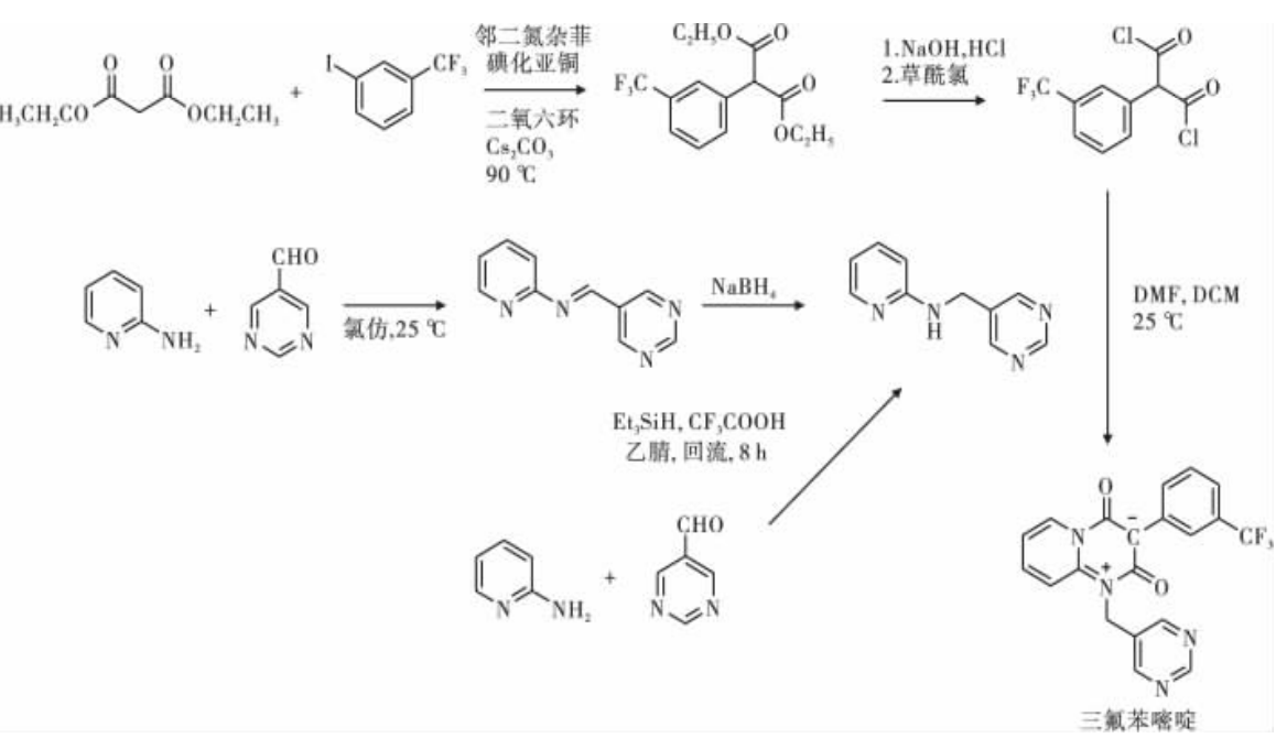 三氟苯嘧啶是以丙二酸二乙酯和间碘三氟甲苯为起始原料,合成2-[3-(三氟甲基)苯基]丙二酸及其酰氯,与中间体N-2-吡啶-5-嘧啶甲胺反应合成,具体合成路线见图3。