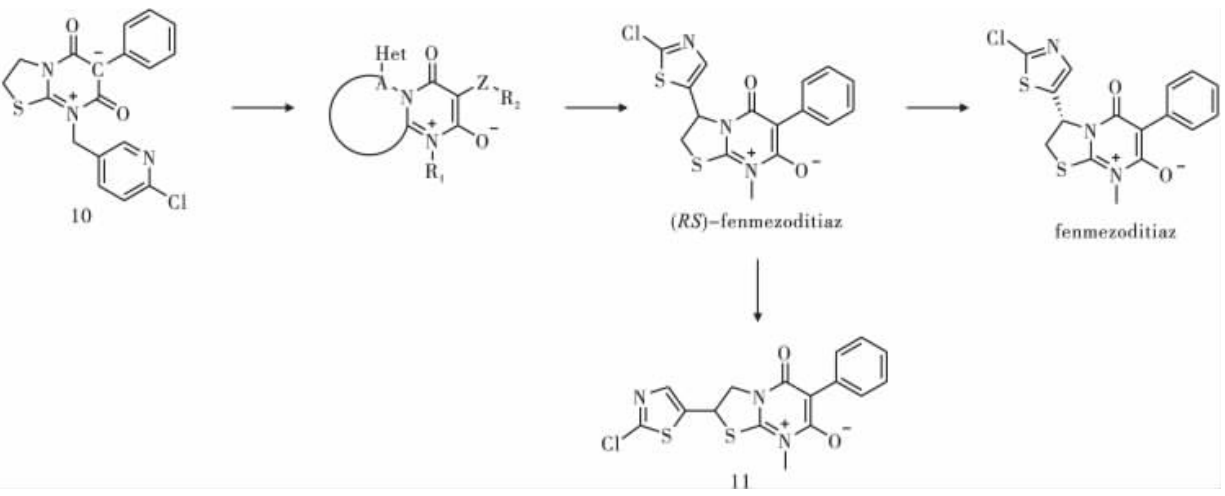 杜邦公司2011年公开了具有嘧啶并噻唑烷的化合物10,巴斯夫公司可能是在该化合物专利上进行了研究优化,合成了一系列嘧啶并杂环烷的化合物,并且将烟碱中间体从嘧啶环上转移到杂环烷上,得到了全新的结构,该专利列表化合物中虽有fenmezoditiaz外消旋混合物,但没有结构和生物活性数据支持。巴斯夫进一步研究,2016年公开了化合物11,在噻唑烷的5位引入了噻唑基团,其对绿桃蚜(Myzus persicae)、兰花蓟马(Dichromothrips corbetti)、二点黑尾叶蝉(Nephotettix virescens)和棉蚜(Aphis gossypii)具有一定的活性。2018年巴斯夫公开了噻唑基团取代的4位噻唑烷结构的用途和合成方法,其中公布了fenmezoditiaz的杀虫活性数据,R型对映体在1 mg/L的质量浓度下对豇豆蚜、黑尾叶蝉、稻褐飞虱的致死率分别为90%、100%、90%,10 mg/L对蓟马的致死率为100%;其外消旋混合物在相同的质量浓度下对豇豆蚜、黑尾叶蝉、稻褐飞虱、蓟马的致死率也分别有80%、50%、54%、73%,而其S型对映体则无杀虫活性。据报道,fenmezoditiaz能有效防治刺吸式口器害虫,如缨翅目、双翅目和半翅目,特别适用于防治缨翅目和半翅目害虫。而且,该类化合物可以防治动物体内和体外寄生虫,用量低,持效期长,对动物安全,化合物及其组合物适用于禾谷类、根系作物、油料作物、蔬菜、香料、观赏植物等。