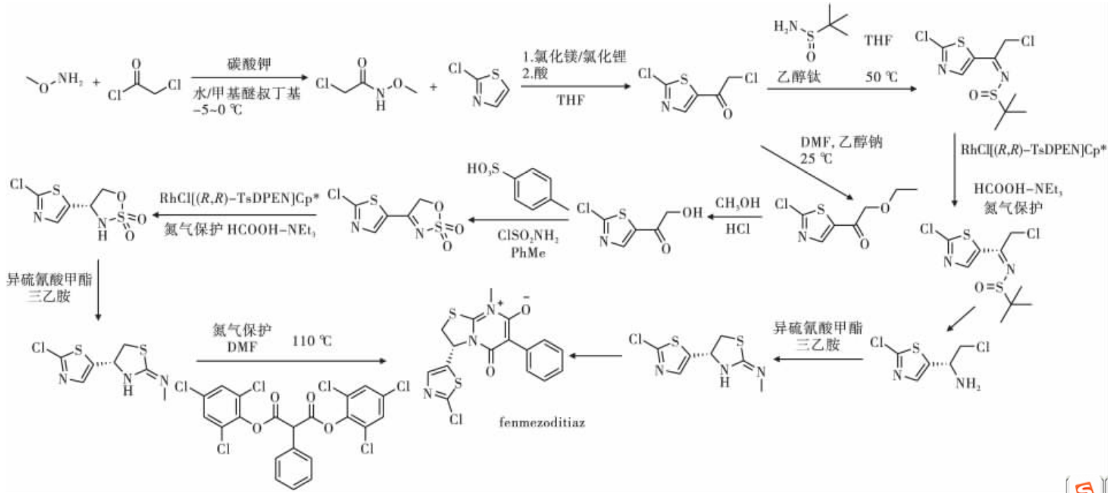 Fenmezoditiaz主要有以下2种合成方法,2种方法部分合成步骤是相同的,主要的不同是在R型异构体合成前的中间体,2种方法分别以氯代磺酰胺和2-甲基丙烷-2-亚磺酰胺分别进行保护,而R型异构体的合成都是采用特制的铑催化剂和甲酸三乙胺在氮气保护条件下反应而得。具体合成路线见图6。