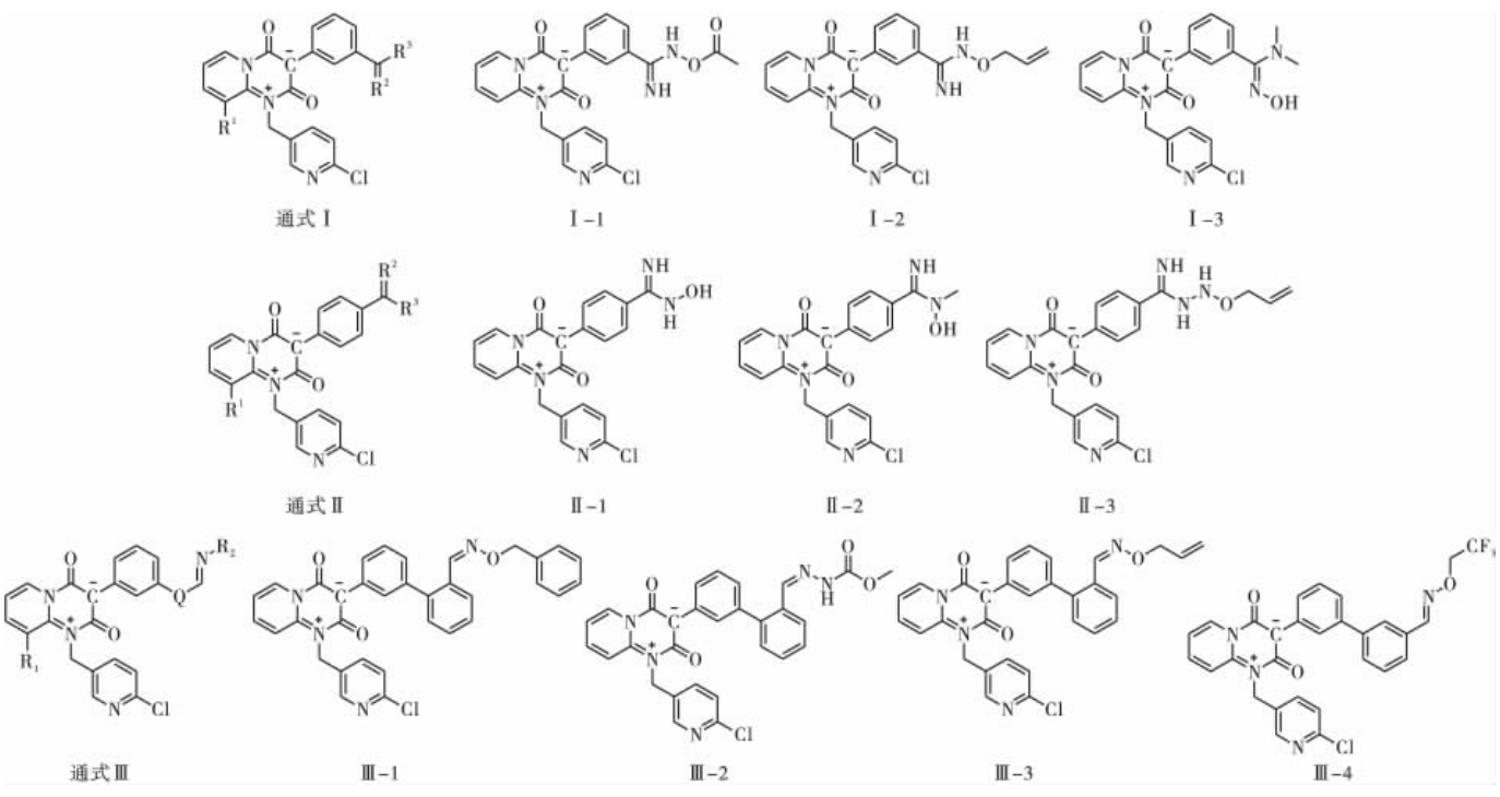 巴斯夫公司在2012年报道了2类化合物Ⅰ和Ⅱ,在300 mg/L质量浓度下,化合物Ⅰ-1、Ⅰ-2、Ⅱ-1、Ⅱ-2、Ⅱ-3对豇豆蚜虫的致死率在75%以上,Ⅰ-1对兰花蓟马的致死率在75%以上;在500 mg/L下,Ⅰ-1、Ⅱ-1、Ⅱ-2、Ⅱ-3对桃蚜的致死率在75%以上,Ⅰ-1、Ⅱ-1、Ⅱ-2对水稻绿叶蝉的致死率在75%以上。相同质量浓度下,Ⅰ-1、Ⅰ-3、Ⅱ-1、Ⅱ-2对水稻褐飞虱的致死率均在75%以上。随后在2014年,进一步公开了一类衍生化合物Ⅲ,在300 mg/L下化合物Ⅲ-1、Ⅲ-2、Ⅲ-3、Ⅲ-4对桃蚜混合种群的致死率在75%以上;Ⅲ-3、Ⅲ-4在300 mg/L下对黏虫的致死率也在75%以上;Ⅲ-2在500 mg/L下对褐飞虱、小菜蛾、水稻绿叶蝉的致死率均在75%以上。从结构活性中可以看出:在嘧啶酮-3位所接的苯环上引入肟、肟醚、脒结构可以显著提升对蚜虫的活性,Ⅰ~Ⅲ结构通式见图7。