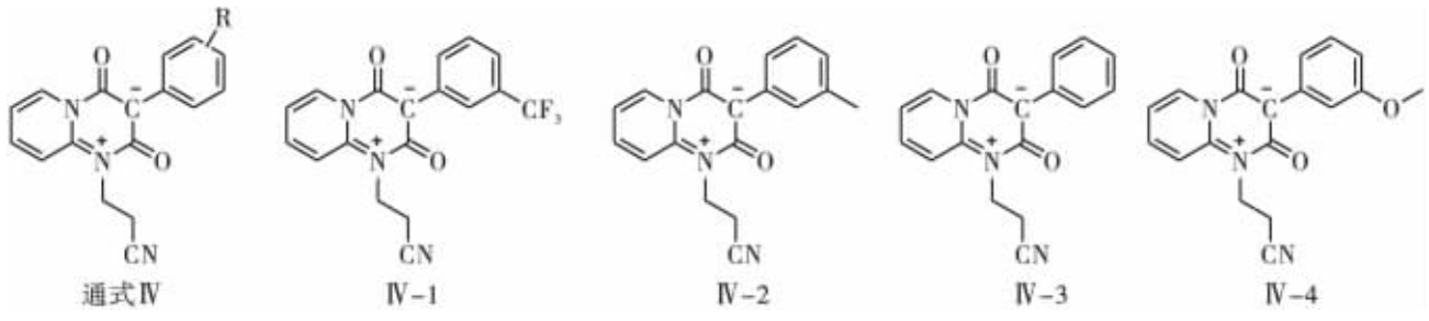 2016年,日本化药株式会社(Nippon Kayaku Co., Ltd.)报道了同类介离子化合物Ⅳ的杀虫活性(结构通式见图8),用氰基乙基替代三氟苯嘧啶中的嘧啶亚甲基,获得了活性更优的杀虫化合物。在棉蚜的防除试验中,化合物Ⅳ-1在0.1 mg/L的质量浓度下对棉蚜的致死率能达到100%,而三氟苯嘧啶在0.2 mg/L下致死率为0;在褐飞虱的防除试验中,化合物Ⅳ-1、Ⅳ-2、Ⅳ-3、Ⅳ-4在0.05 mg/L下对褐飞虱的致死率均在70%以上,而三氟苯嘧啶在0.1 mg/L的质量浓度下致死率仅为10%。由此表明:氰基乙基可以作为一个优秀活性基团来替代嘧啶酮-1位的嘧啶-5-亚甲基、2-氯-噻唑-5-亚甲基、6-氯-吡啶-3-亚甲基等结构。