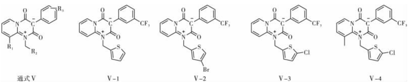 沈阳中化农药化工研发有限公司在三氟苯嘧啶结构基础上对嘧啶酮的1-位取代五元杂环进行了优化研究。2019年报道了一类化合物Ⅴ(结构通式见图9),用卤代噻吩甲基替代卤代噻唑甲基,其中Ⅴ-1、Ⅴ-2在10 mg/L的质量浓度下对小菜蛾的致死率可达到100%;在100 mg/L的质量浓度下化合物Ⅴ-3、Ⅴ-4对黏虫的致死率均在90%以上。