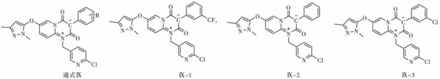 除此之外,东阳光公司还对吡啶部分进行了衍生优化研究,2020年报道了一类化合物Ⅸ(见图11),在200 mg/L质量浓度下,Ⅸ-1对小菜蛾的致死率为80%,Ⅸ-2、Ⅸ-3对小菜蛾的致死率为100%;而三氟苯嘧啶对小菜蛾的致死率仅为51%。在吡啶环上引入1,3-二甲基吡唑取得了不错的杀虫活性,这在之前的报道中没有相似的案例,为吡啶并嘧啶酮类介离子化合物以后的研究提供了新的方向。
