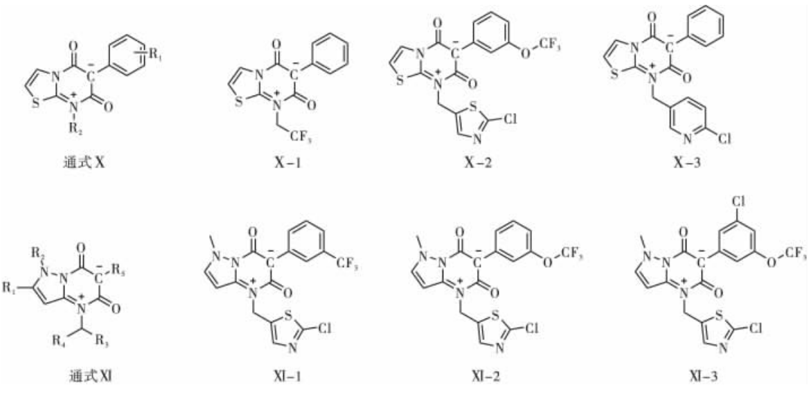 杜邦公司在发现吡啶并嘧啶酮类介离子化合物的杀虫活性之后,报道了很多杂环并嘧啶酮类化合物。其中五元杂环(呋喃、噻唑、吡唑等)并嘧啶酮类介离子化合物也具有很好的杀虫活性,如通式化合物Ⅹ(见图12)中的Ⅹ-1、Ⅹ-2、Ⅹ-3在50 mg/L的质量浓度下,对玉米蜡蝉(Peregrinus maidis)的致死率在80%以上,Ⅹ-2、Ⅹ-3在相同质量浓度下对马铃薯叶蝉的致死率在80%以上。2019年,先正达公司报道了一类吡唑并嘧啶酮介离子化合物Ⅺ(见图12),Ⅺ-1、Ⅺ-2在200 mg/L的质量浓度下对黄瓜条叶甲(Diabrotica balteata)、小菜蛾、海灰翅夜蛾(Spodoptera littoralis)的致死率均在80%以上,其中Ⅺ-2在12.5 mg/L的质量浓度下对海灰翅夜蛾的致死率可达到80%以上。