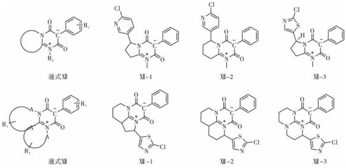 2014年巴斯夫公司报道了一类脂肪环并嘧啶酮类介离子化合物Ⅻ(见图13),化合物Ⅻ-1、Ⅻ-2在500 mg/L的质量浓度下,对桃蚜、兰花蓟马、二点黑叶尾蝉的致死率在75%以上;Ⅻ-3在500 mg/L的质量浓度下对稻飞虱和叶螨的致死率在75%以上。此外,巴斯夫公司还发现了一类由2个脂肪环和嘧啶酮组成的三环结构的介离子化合物XⅢ(见图13),生测结果显示,在500 mg/L的质量浓度下该类化合物对褐飞虱、兰蓟马和水稻绿叶蝉的致死率在75%以上。整体上看,Ⅻ和XⅢ这2类化合物都增加了饱和杂环,以期提高其生物活性。