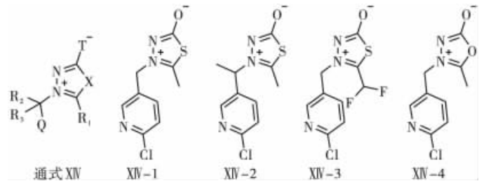 2013年,巴斯夫公司报道了一类具有杀虫活性的新颖噻(噁)二唑类介离子化合物ⅪⅤ(见图14)。其中化合物ⅪⅤ-1、ⅪⅤ-2在300 mg/L的质量浓度下对银叶粉虱的致死率在75%以上;ⅪⅤ-3在500 mg/L的质量浓度下对豇豆蚜的致死率在75%以上;ⅪⅤ-1~ⅪⅤ-4在500 mg/L的质量浓度下对兰花蓟马的致死率在75%以上,而这类化合物对桃蚜、棉铃象、地中海实蝇、烟草芽孢子虫的活性一般。