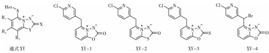 先正达公司2015年报道了一类吡啶并噁二唑类介离子化合物ⅩⅤ(见图15),这类化合物专利报道的通式结构中正负电荷分别表示在二唑环的2个N原子上,对桃蚜和褐飞虱表现出了很好的活性,该类化合物在200 mg/L的质量浓度下对桃蚜的致死率在80%以上。另外此类化合物还表现出优秀的内吸活性,在浸根试验中,ⅩⅤ-1~ⅩⅤ-4在24 mg/L的质量浓度下对桃蚜的致死率在80%以上,ⅩⅤ-1、ⅩⅤ-4在12.5 mg/L的质量浓度下对褐飞虱的致死率在75%以上。