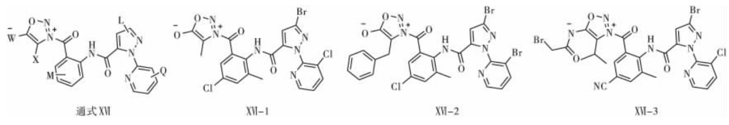 2020年,华东理工大学钱旭红等公开了一类噁二唑类介离子化合物ⅩⅥ(见图16),这类化合物从结构上看,属于双酰胺类杀虫剂与介离子类的拼接,其对黏虫、小菜蛾、棉铃虫、亚洲玉米螟、稻纵卷叶螟等具有较好的防效。在100 mg/L的质量浓度下ⅩⅥ-1~ⅩⅥ-3等多个化合物对上述害虫致死率均达到100%。