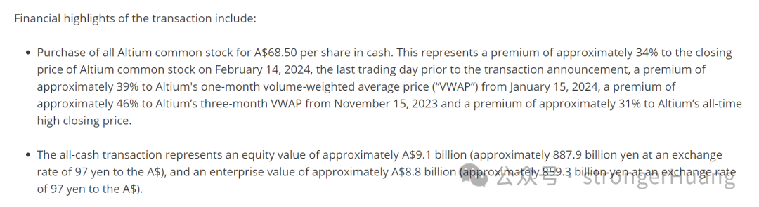 根据交易条款,在满足多项条件的前提下,瑞萨电子将以每股68.50澳元 的现金收购Altium的所有普通股。这比2024年2月14日(交易公告前的最后一个交易日)Altium普通股的收盘价溢价约34%,比2024年1月15日起Altium的一个月交易量加权平均价格溢价约39%,比2023年11月15日起Altium的三个月交易量加权平均价格溢价约46%,比Altium的历史最高收盘价溢价约31%。