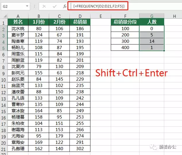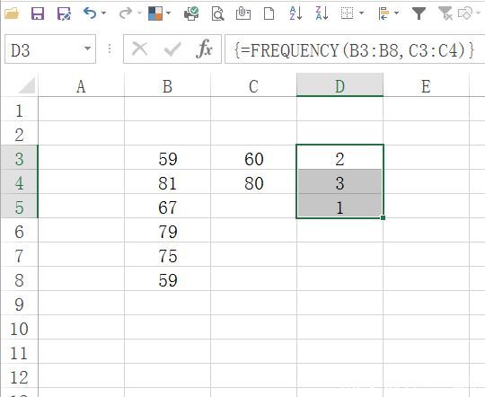 先选中D3:D5,输入公式=FREQUENCY(B3:B8,C3:C4)Ctrl+Shift+Enter(这是数组回车)参数: