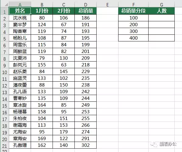 下面来做一个实例。如下图,统计总销量在不同区间的人数。