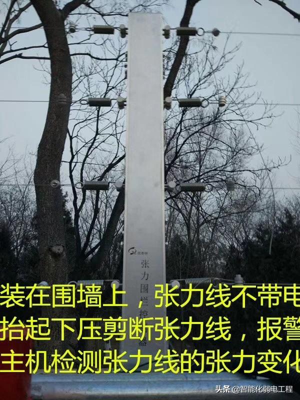 2、张力式电子围栏,也常用四线和六线,外形跟脉冲式差不多。当有人拉拉任意一根合金线缆时,线缆两端的传感器触发,主机即发出报警信号。