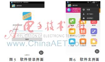 软件登录模块将通过用户输入学号及密码与服务器通信验证完成登录操作,如图5所示。软件主界面是软件的功能导航界面,软件所有的功能入口体现在主界面,如图6所示。