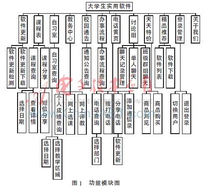 根据系统需求分析得知该软件共有以下功能模块:软件更新模块、课程表查询模块、自习室查询模块、教务中心登录模块、校园公告查询模块、办事流程查询模块、电话黄页查询模块、讨论组模块、天天特价模块、精品应用推荐模块、登录管理等模块。软件总体功能模块如图1所示。