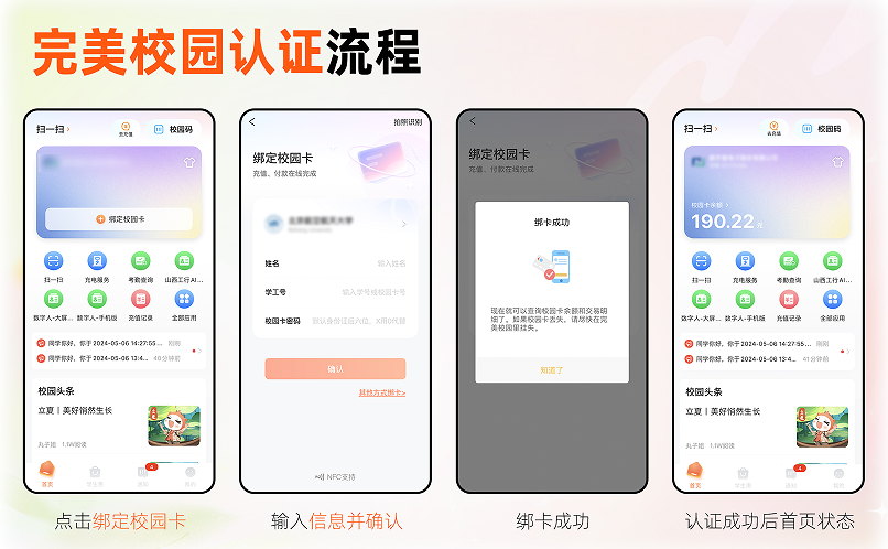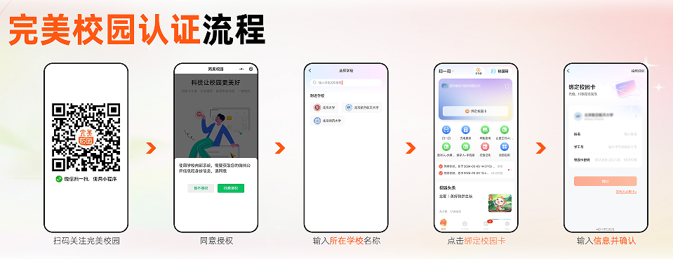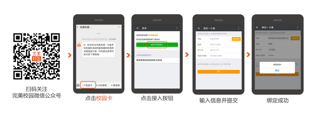 微信扫码或者搜索完美校园微信小程序,同意授权,输入学校等信息,绑定成功