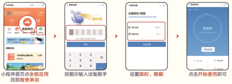 打开完美校园,首页点击-【全部应用】找到-【宿舍淋浴】,输入设备码绑定设备,开始使用,使用结束后关闭,还可自主设置【消费时长】和【消费限额】