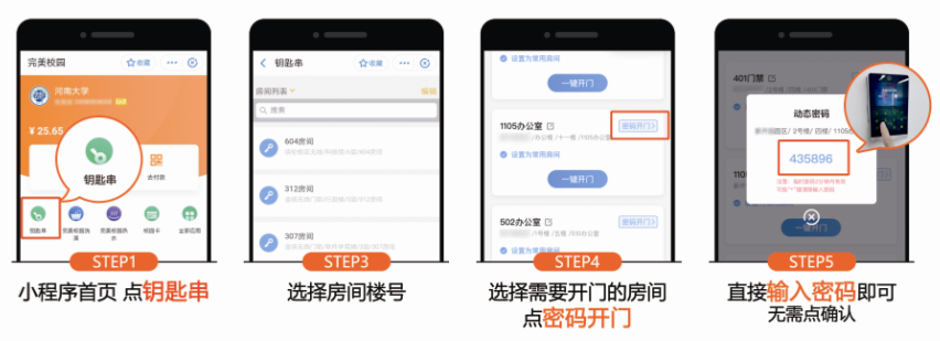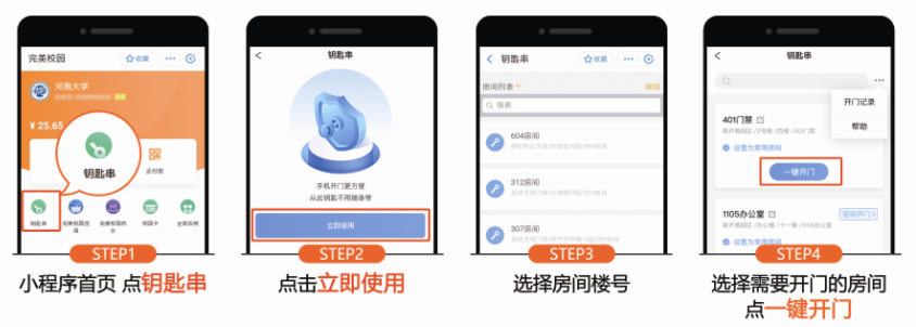 通过完美校园App或者支付宝完美校园小程序,在首页功能区内找到【钥匙串】,可对学校的教学楼、宿舍等门禁、门锁进行开门操作,还可以查看历史开门记录。使用流程如下: