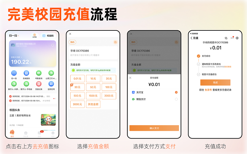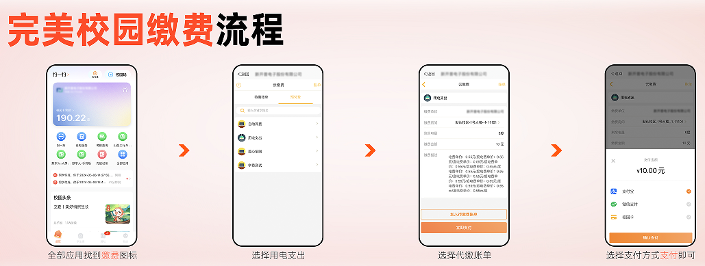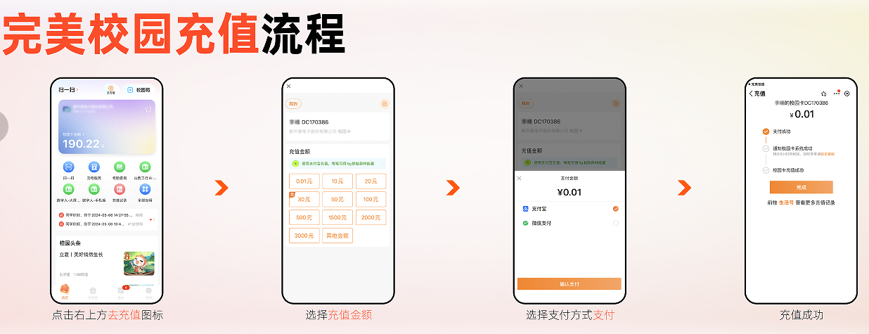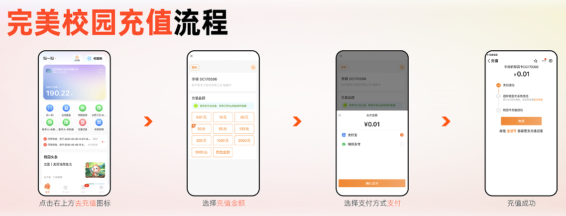 目前,支持通过完美校园App或者支付宝完美校园小程序、完美校园微信小程序进行消费,同学们可按照学校具体开通功能的情况,选择消费方式,使用流程如下: