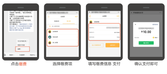 ②点击公众号底部菜单栏-【充值缴费】-【缴费】,选择缴费项,确认缴费信息后,进行支付缴费。