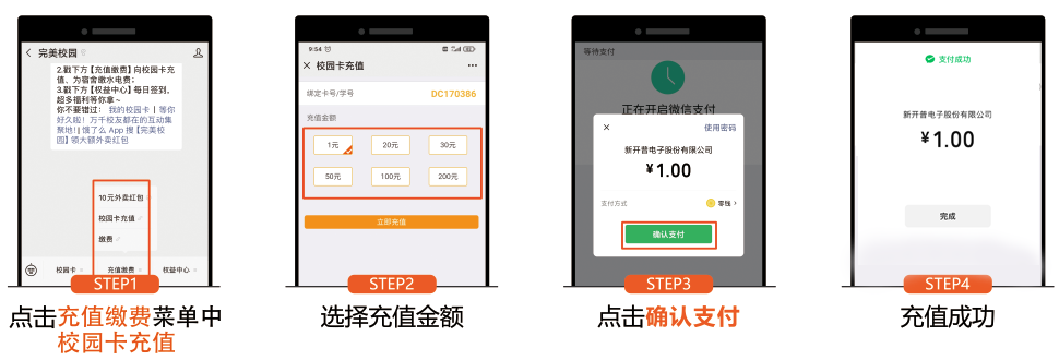 (2)在完美校园公众号首页,点击-左下角【校园卡】-【充值】,选择金额,进行充值;