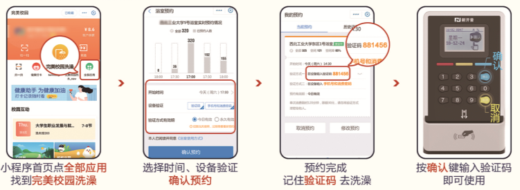 打开完美校园,首页点击-【全部应用】找到-【完美校园洗澡】,查看浴室预约情况,选定预约时间和验证方式,预约成功并使用,还可自主设置【消费时长】和【消费限额】
