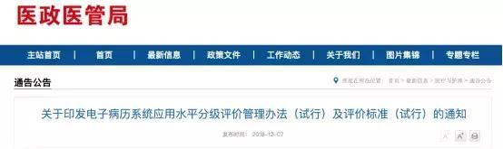 2018年12月7日,国家卫健委医政医管局发布《关于印发电子病历系统应用水平分级评价管理办法(试行)及评价标准(试行)的通知》。