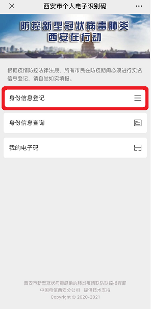 1.进入“西安市民电子识别码平台”后,选择“身份信息登记”。