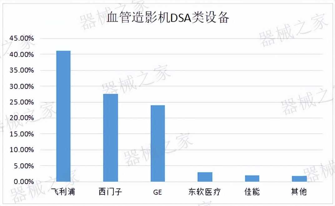 而从血管造影机DSA类设备来看,在此类中位居榜首的飞利浦以41.10%稳居,其次是西门子以27.60%占据榜二,而榜三是以24.00%占比的飞利浦;
