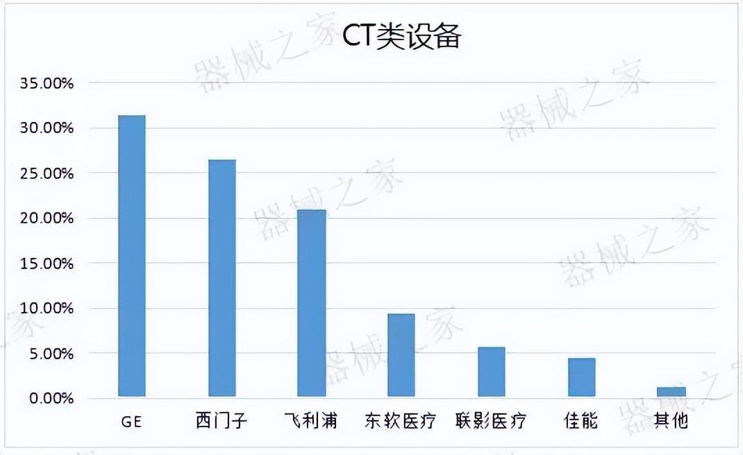 根据此医疗影像设备行业调查所了解到,在CT类设备当中,位居榜首的是GE医疗以31.50%稳居,其次是西门子以26.50%占据榜二,榜三则是以20.90%占比的飞利浦;