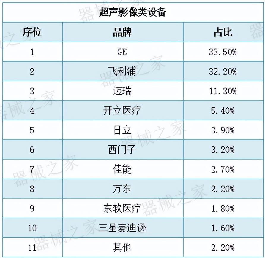 在射线类设备排行榜当中,共有十一家国内外品牌上名榜单,我们看到位居榜首的为GE医疗其占比33.50%,其次榜二是以32.20%上榜 的飞利浦,而榜三是以11.30%上榜的的迈瑞,可见国产也跟近了国外的步伐;