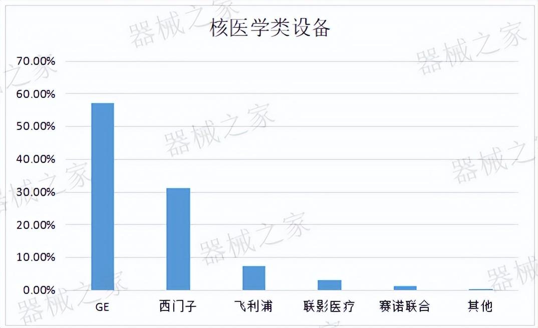 而从核医学类设备来看,在此类中位居榜首的是GE以57.30%稳居,其次是西门子以31.10%占据榜二,而榜三是以7.30%占比的飞利浦;