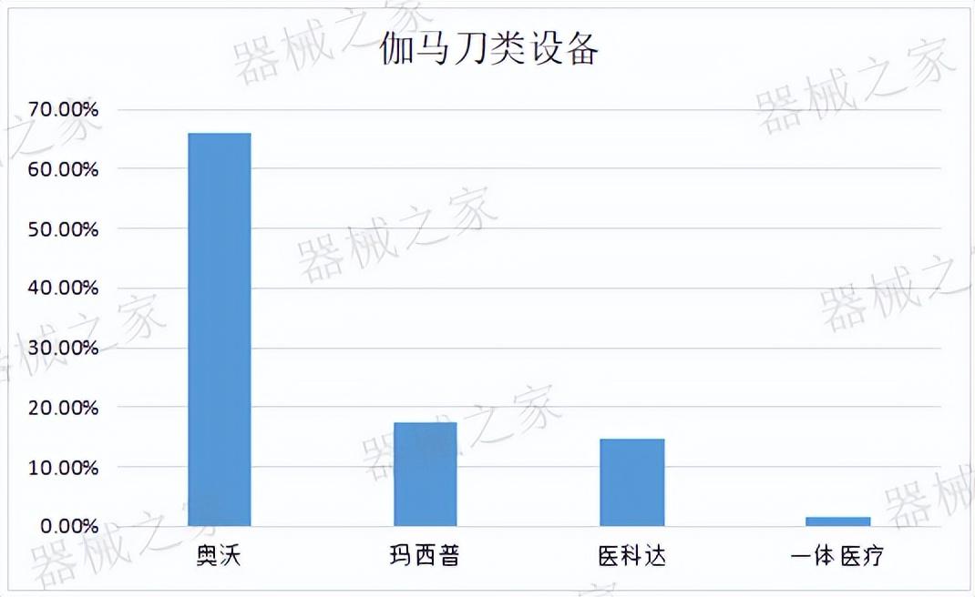 而从伽马刀类设备来看,在此类中位居榜首的是奥沃以66.20%稳居,其次是玛西普以17.60%占据榜二,而榜三是以14.70%占比上榜的医科达;一体医疗位居榜四占比1.50%。