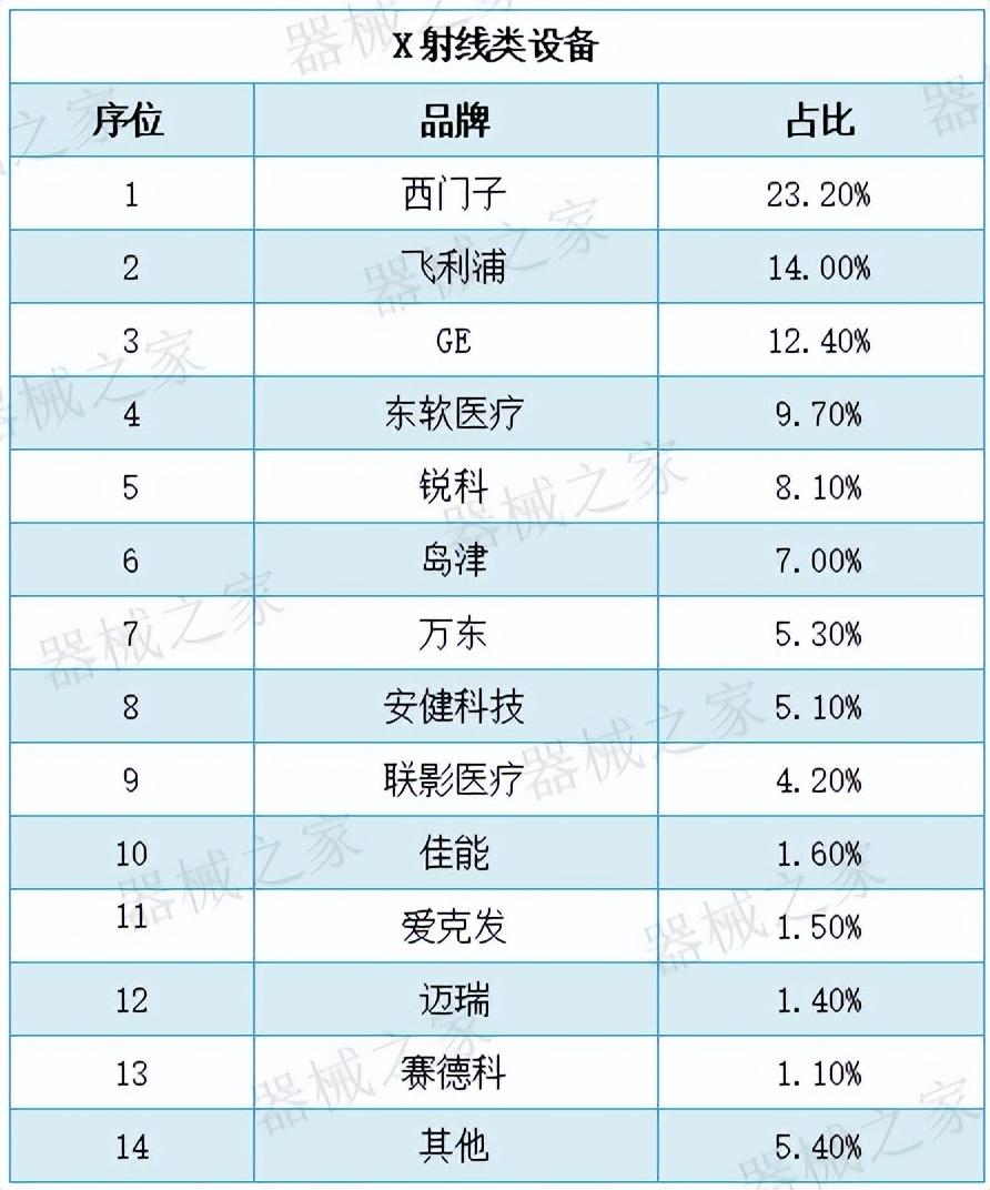 在射线类设备排行榜当中,共有十三家国内外品牌上名榜单,我们看到“GPS”仍霸据榜三,而三位品牌占比一共为49.6%,就这三位外企巨头,再加上其他外企就已经占整个市场的二分之一了;