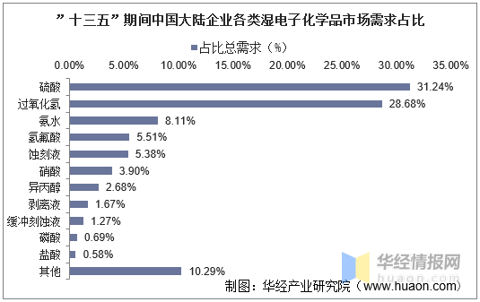 中国大陆企业若以各类湿电子化学品的市场需求占总需求量的比例来估算,过氧化氢占比28.68%、硫酸占比31.24%、氨水占比8.11%、蚀刻液占比5.38%、氢氟酸占比5.51%、硝酸占比3.9%、盐酸占比0.58%、异丙醇占比2.68%、剥离液占比1.67%、缓冲刻蚀液占比1.27%、磷酸占比0.69%。