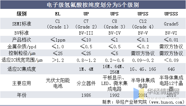 电子级氢氟酸,又名高纯度氢氟酸,属于半导体用湿电子化学品中通用的湿化学品一类,电子级氢氟酸按纯度划分以下五个级别: