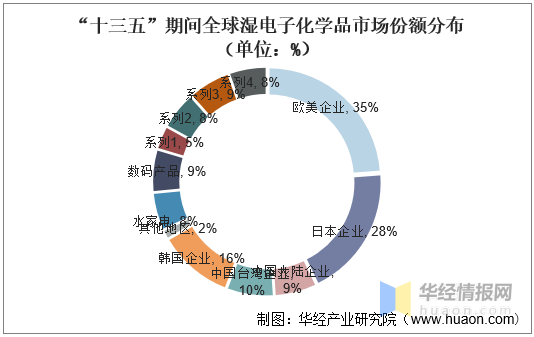 “十三五”期间,全球湿电子化学品市场份额(以销售额计)中,欧美企业占35%,日本企业占28%,中国企业占19%(中国大陆企业占9%,中国台湾企业占10%),韩国企业占16%,其他地区企业约占2%。