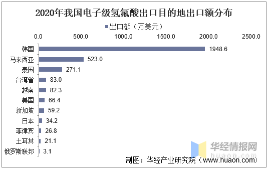 2020年我国电子级氢氟酸共出口到11个国家或地区,其中韩国是我国电子级氢氟酸出口主要目的地,2020年出口额为1948.6万美元;排第二的马来西亚,2020年出口额为523万美元;其次是泰国,2020年出口额为271.1万美元。