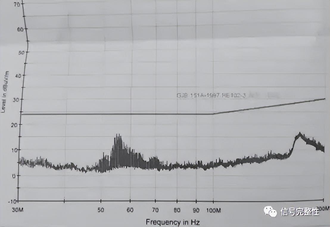 该系统为军用汽车通信端产品,要求通过GJB151A陆军地面设备电磁兼容试验要求。产品在EMC实验室测试时,CE102、CS101、CS114、RS103均顺利通过试验,但RE102测试结果如图1所示: