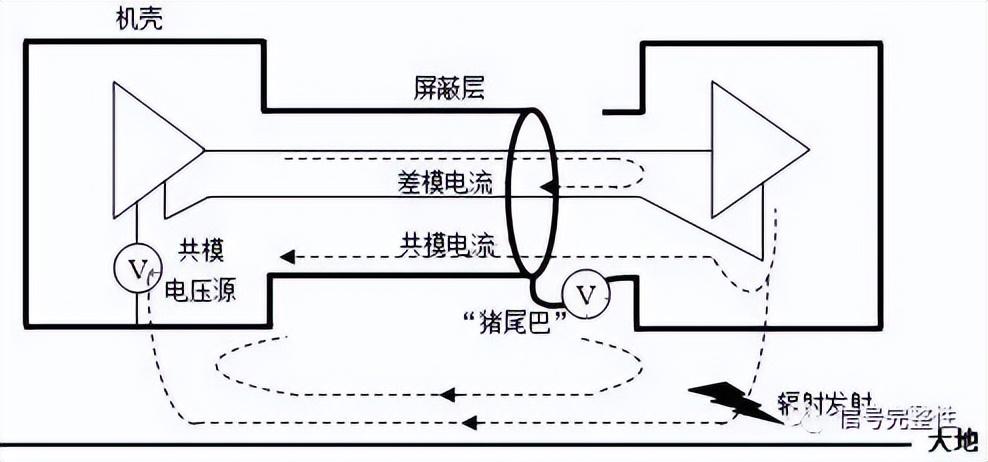 共模电流返回路径的阻抗由屏蔽层自身阻抗和屏蔽层与金属机箱之间的搭接阻抗两部分组成。“猪尾巴”的端接方式相当于在屏蔽层上串联了一个数十nH的电感,其一会增大屏蔽层共模电流返回路径的阻抗,导致部分共模电流从大地返回,增大了共模电流的环路面积;其二共模电流会在屏蔽层产生共模电压,该电压会在屏蔽层与大地形成的环路(分布电容或地线形成)中产生新的共模电流,导致更大的共模辐射,具体原理如图9所示: