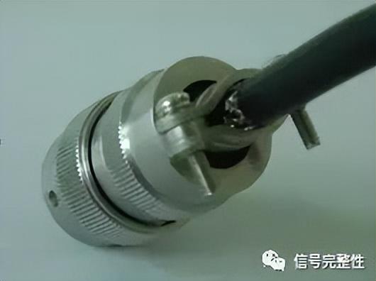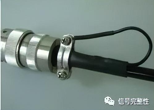 对于屏蔽线缆,要满足屏蔽要求,需要将线缆屏蔽层360度端接,以形成良好的导电搭接,在航空插头的夹扣处,去除线缆绝缘套,露出屏蔽层,然后直接将屏蔽层用连接器末端的夹子卡住,将螺丝拧紧固定,形成360度端接,如图11所示。