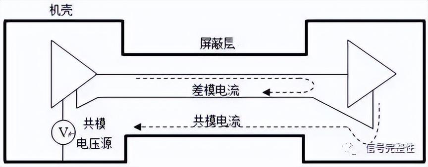 屏蔽电缆减小电缆辐射的原因主要有两个:一是屏蔽层可以屏蔽电缆中差模信号回路的差模辐射;另一个是屏蔽层可以为共模电流提供一个返回路径,从而减小了共模电流的回路面积,从这个意义上说,返回路径的阻抗越小越好,这样可以将大部分共模电流旁路回共模噪声源,具体原理如图8所示: