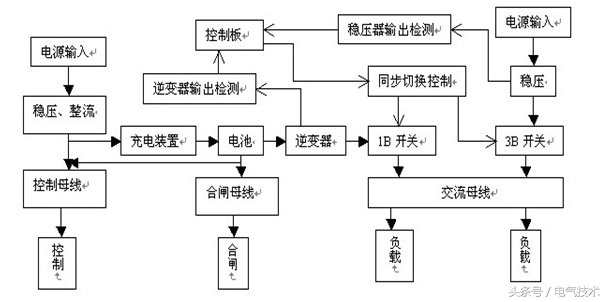 图1是原UPS原理图,三相380V AC输入电源经过变压、整流、稳压成为220V DC,送至控制母线,其用户主要包括高压控制系统电源、控制系统中的供电电源。同时,整流后的220V DC通过充电装置给电池充电,合闸母线直接接在电池的两端,它的用户主要是高、低压真空断路器的操作电源。另外三相380V AC输入电源经过变压、稳压成为220V AC,经过闭合的3B开关送至交流母线,交流母线的负载主要是仪表控制电源(DCS、ESD及三大机组控制电源)、低压控制电源。