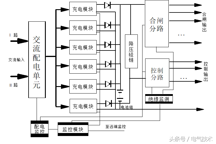 对于“5+1”并机冗余直流屏系统,当系统交流输入正常时,通过交流配电单元给各个充电模块供电。充电模块将三相交流电转换为220V的直流,经过隔离二极管隔离后输出,一方面给电池充电,另一方面给负载供电(图3)。