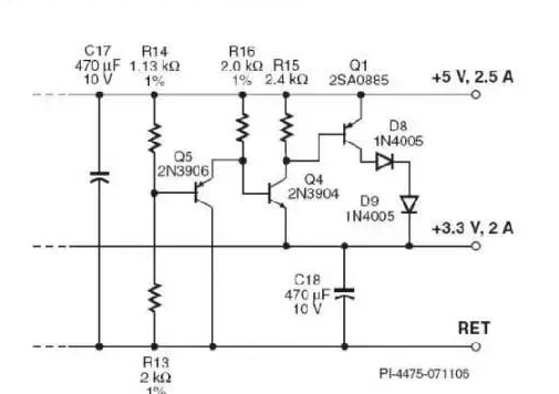 Q1中的电流量由两个输出端的电压差异决定。因此,该电路可以使两个输出端均保持稳压,而不受其负载的影响,即使在3.3V输出端满载而5V输出端无负载这样最差的情况下,仍能保持稳压。设计中的Q5和Q4可以提供温度补偿,这是由于每个三极管中的VBE温度变化都可以彼此抵消。二极管D8和D9不是必需的器件,但可用于降低Q1中的功率耗散,从而无需在设计添加散热片。