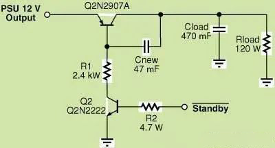 图十所示为简单的BJT串联旁路开关,电压为12 V,输出电流强度为100 mA,并带有一超大电容(CLOAD)。晶体管Q1为串联旁路元件,由Q2根据待机信号的状态来控制其开关。电阻R1的值是额定的,这样可确保Q1有足够的基值电流在最小Beta和最大的输出电流下以饱和的状态工作。PI建议额外添加一个电容器(Cnew),用以调节导通时的瞬态电流。如果不添加Cnew,Q1在导通后即迅速进入电容性负载,并因而产生较大的电流尖峰。为调节该瞬态尖峰,需要增加Q1的容量,这便导致了成本的增加。