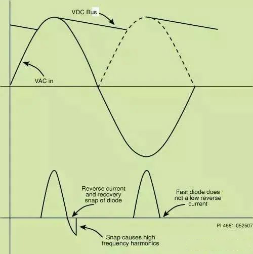 如果在桥式整流器中使用快速恢复二极管,就无需使用这些电容了。当这些二极管之间的电压开始反向时,它们的恢复速度非常快(参见图2)。这样通过降低随后的高频关断急变以及EMI,可以降低AC输入线中的杂散线路电感激励。由于2个二极管可以在每半个周期中实现导通,因此4个二极管中只需要2个是快速恢复类型即可。同样,在每半个周期进行导通的两个二极管中,只需要其中一个二极管具有快速恢复特性即可